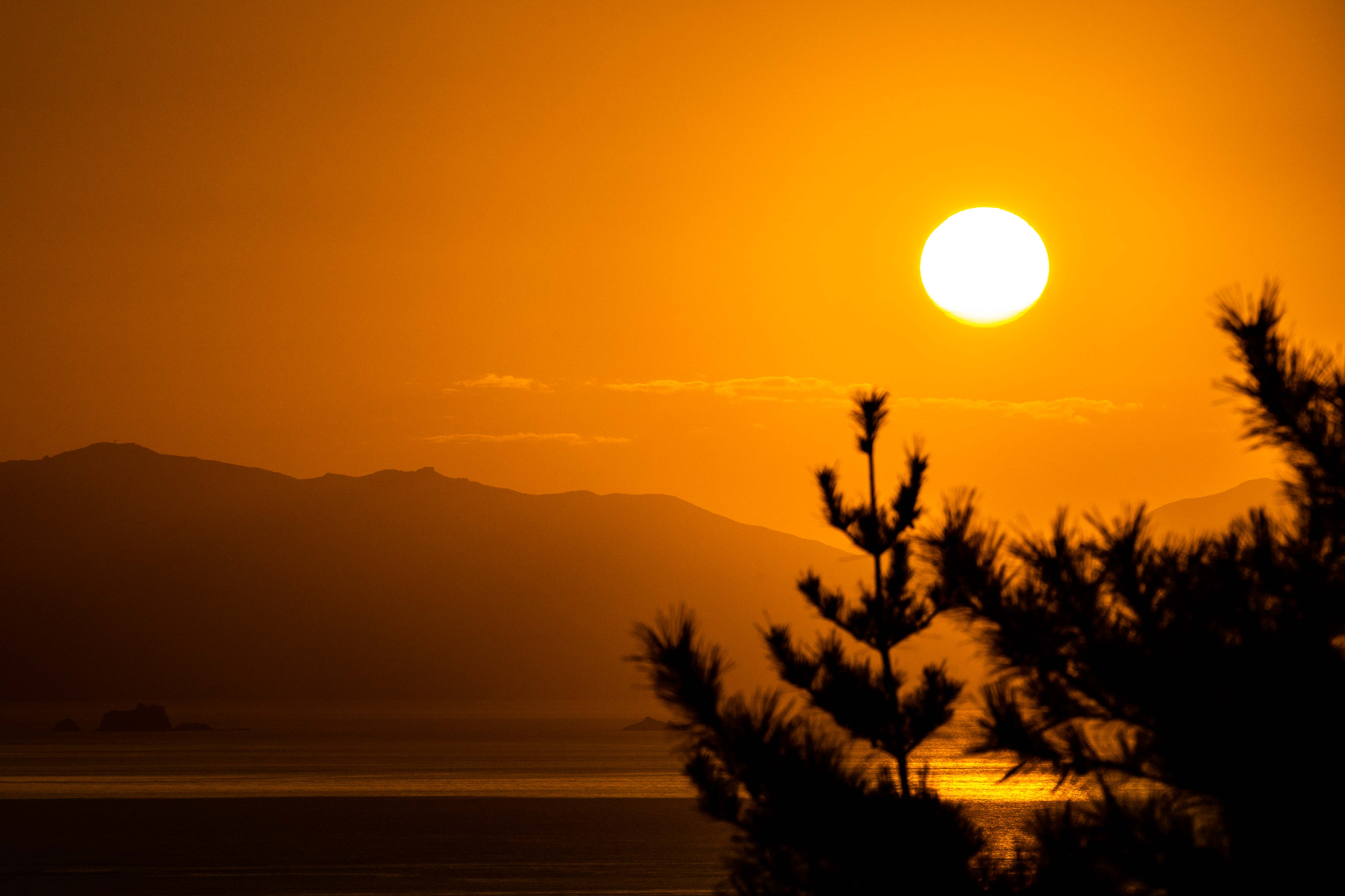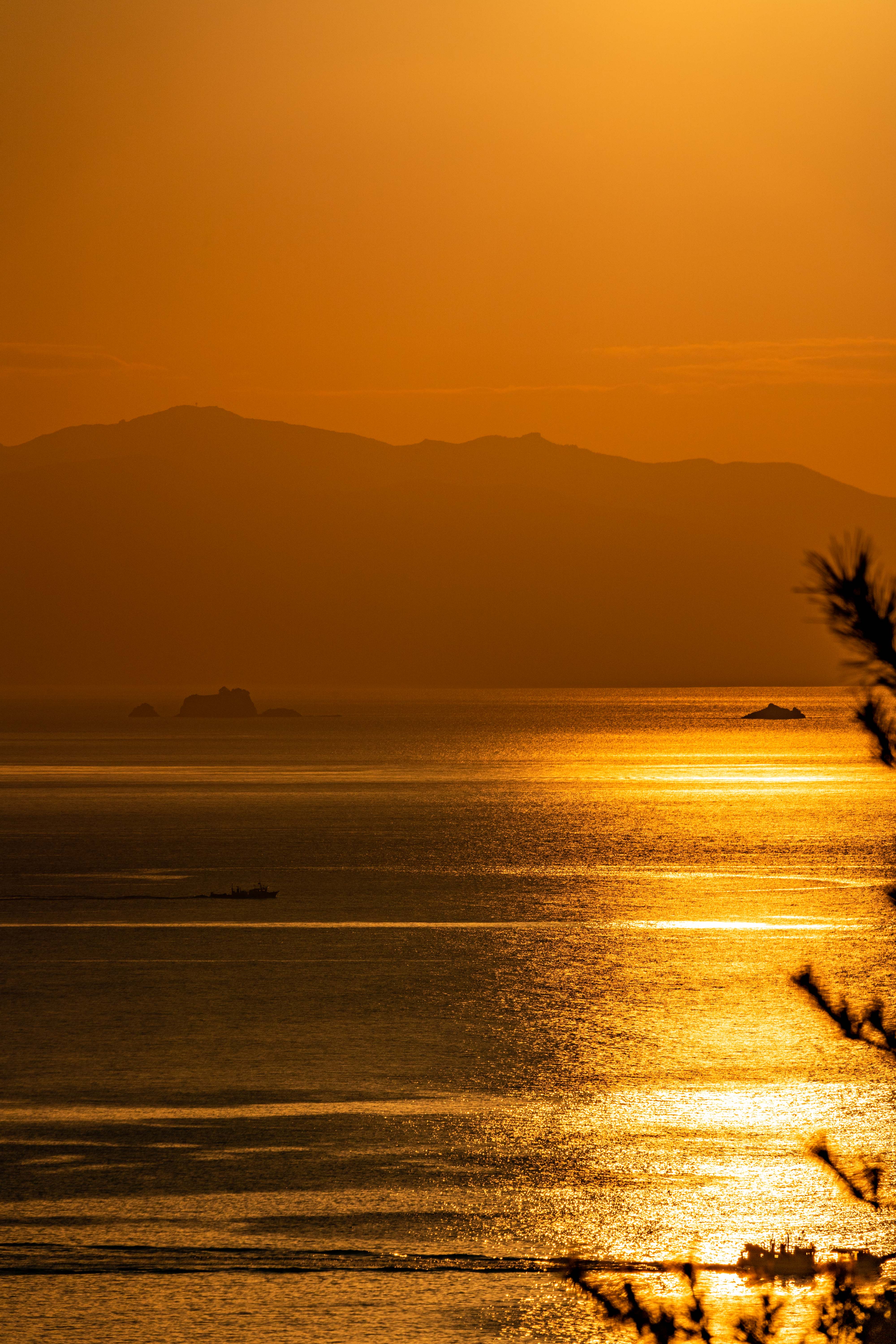 바다 산 하늘이 이어지며 파랑 - 검정 - 빨강으로 그라데이션을 만들어냅니다.
