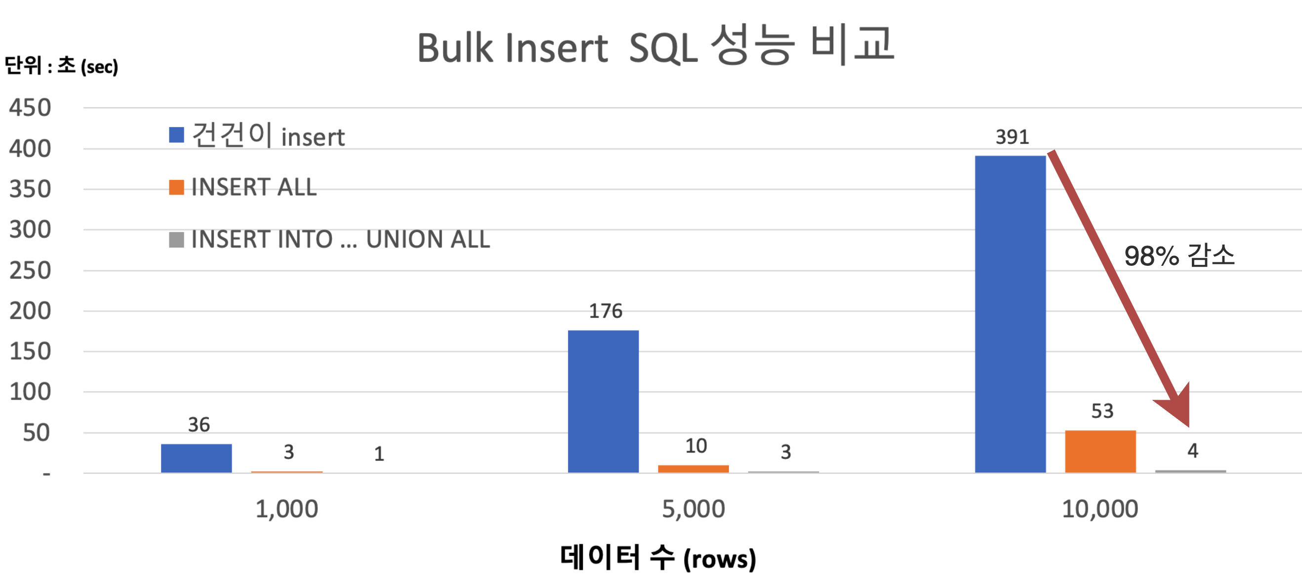 UNION ALL 절을 사용한 bulk insert가 다른 스크립트보다 소요시간이 짧은 것을 확인했다. UNION ALL 절을 사용해 적절한 사이즈를 잡아 중간마다 commit을 해준다면 DB의 실행 시간이 줄어들어 DB로부터의 응답 시간을 획기적으로 줄일 수 있을 것이다. 1만 건 기준으로 1번 방법보다 98% 이상 빨라졌다. (6m 31s -> 4s)
