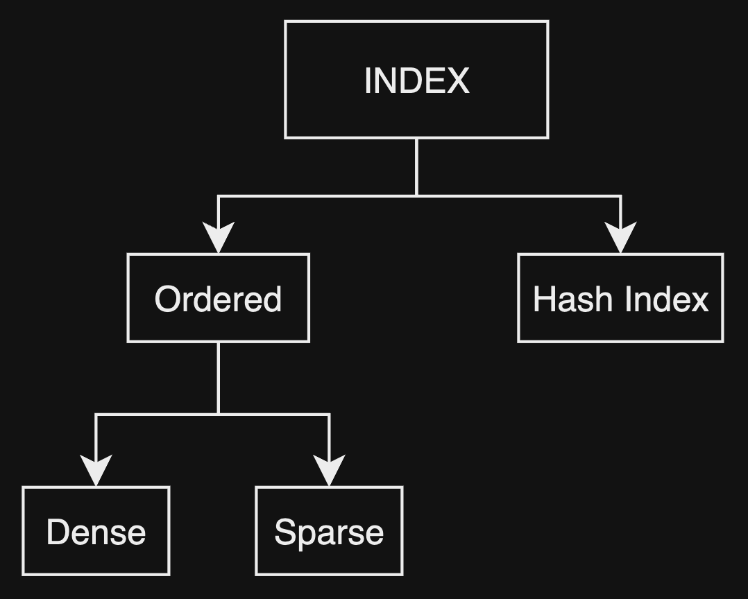 일반적인 Oredered Index는 Index의 구조 자체가 커지면 Index의 Access time이 증가한다. Index 구조상 한쪽에서부터 탐색을 시작하는데 찾고자 하는 값이 인덱스 정중앙의 값이라면 어떻게 될까. 정중앙의 값을 찾는 속도는 인덱스의 구조가 커질수록 비례하여 저하될 것이다. 인덱스를 재구조화할 수 있지만 재구조하는 작업 빈도가 많아지면 Insertion time, Deletion time이 증가한다.
