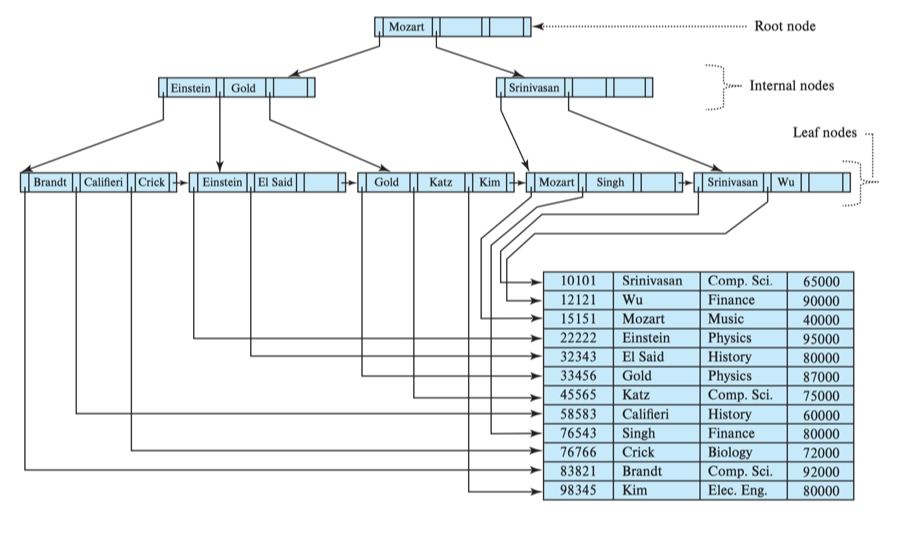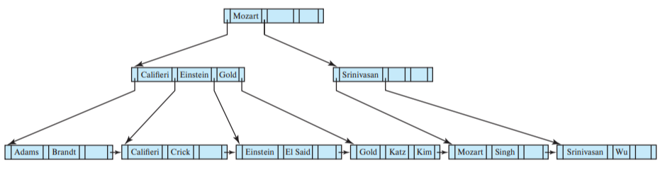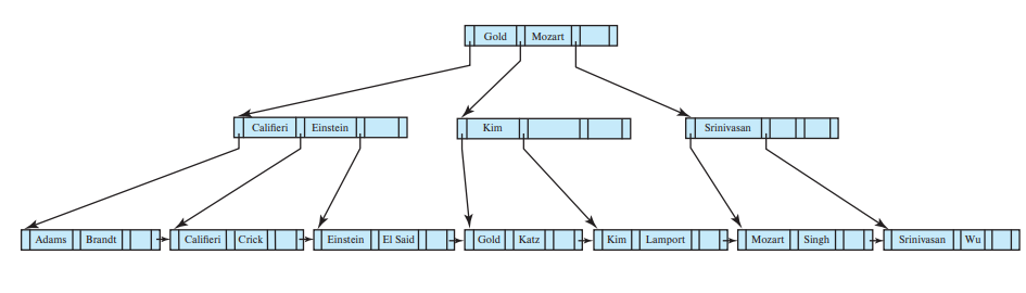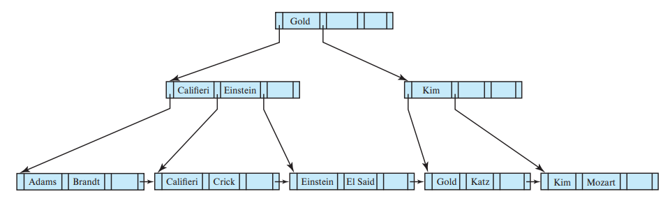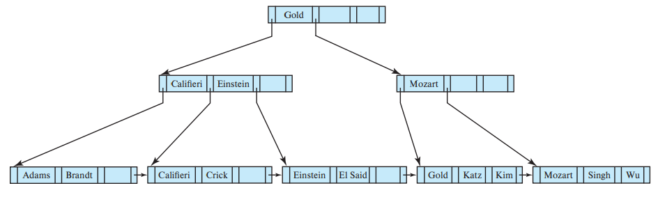 어떤 노드의 Pi가 가리키는 서브트리의 모든 search key는 Ki보다 작고 K(i-1) 보다 같거나 크다. 위 예시에서 Gold가 속한 내부노드의 P2가 가리키는 서브트리의 모든 search key는 K3(Gold) 보다 작고 K2(Einstein) 보다 같거나 큰 것을 확인할 수 있다.