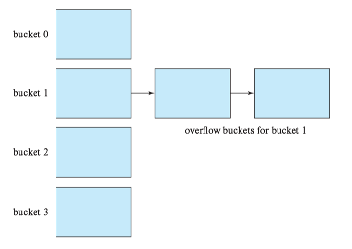 이와 같이 2개 이상의 record를 하나의 Bucket에 저장하는 방식을 Overflow chaining (closed addressing, closed hashing)이라고 한다.