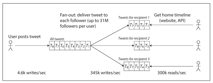 - Post tweet : 사용자가 메시지를 팔로워들에게 publish 한다. (평균 4.6K req/sec, 피크 12k req/sec)