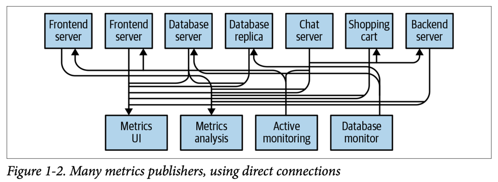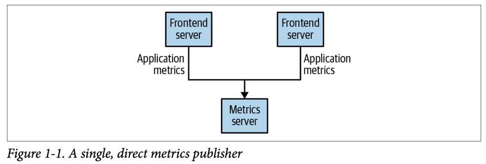 예를 들어 특정 모니터링 정보를 수집하는 애플리케이션이 있다고 해보자. 그럼 아래 그림처럼 하나의 Metrics server와 각 모니터링 정보를 전송하는 1개 이상의 Frontend server가 있을 것이다.
