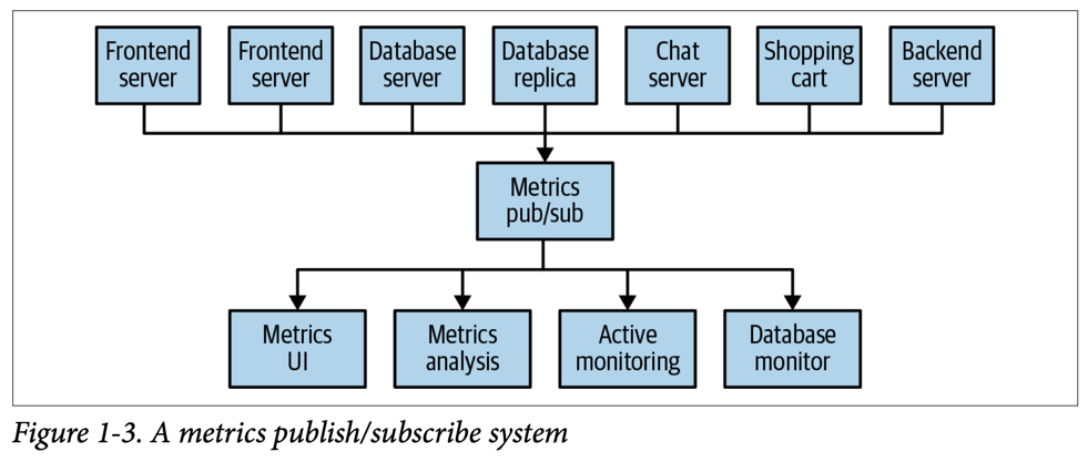 서버 수는 그대로지만 데이터 흐름이 단순해졌다. 모니터링 정보를 전송하는 서버는 Pub/Sub 시스템에 데이터를 발행하고, 모니터링 정보 수집서버는 Pub/Sub 시스템으로부터 데이터를 소비한다.