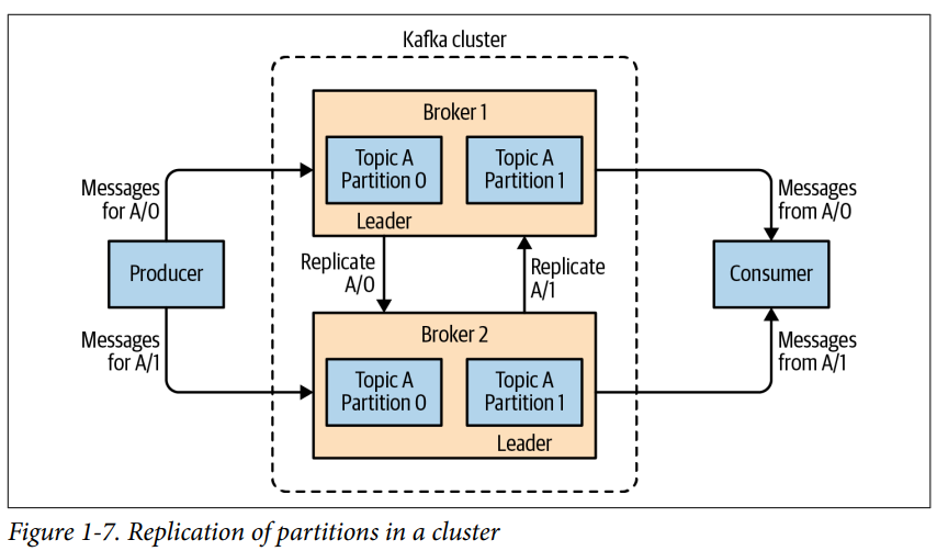 여러 개의 Broker를 클러스터링 할 수 있다. (아래 그림 참고) cluster 중 하나의 broker를 컨트롤러로 자동으로 선정한다. 컨트롤러는 관리자로서 partition을 broker에 할당, 각 broker에서 발생하는 장애를 모니터링한다.