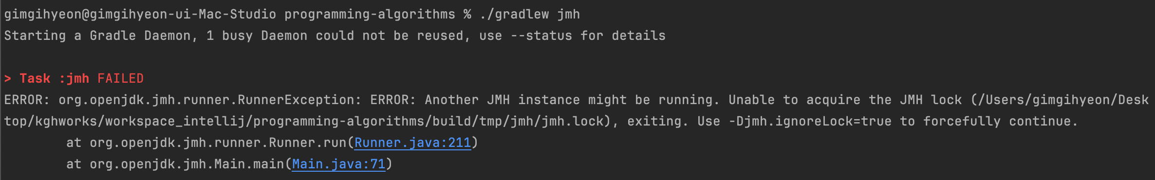 ERROR: org.openjdk.jmh.runner.RunnerException: ERROR: Another JMH instance might be running. Unable to acquire the JMH lock (/Users/gimgihyeon/Desktop/kghworks/workspace_intellij/programming-algorithms/build/tmp/jmh/jmh.lock), exiting. Use -Djmh.ignoreLock=true to forcefully continue.
