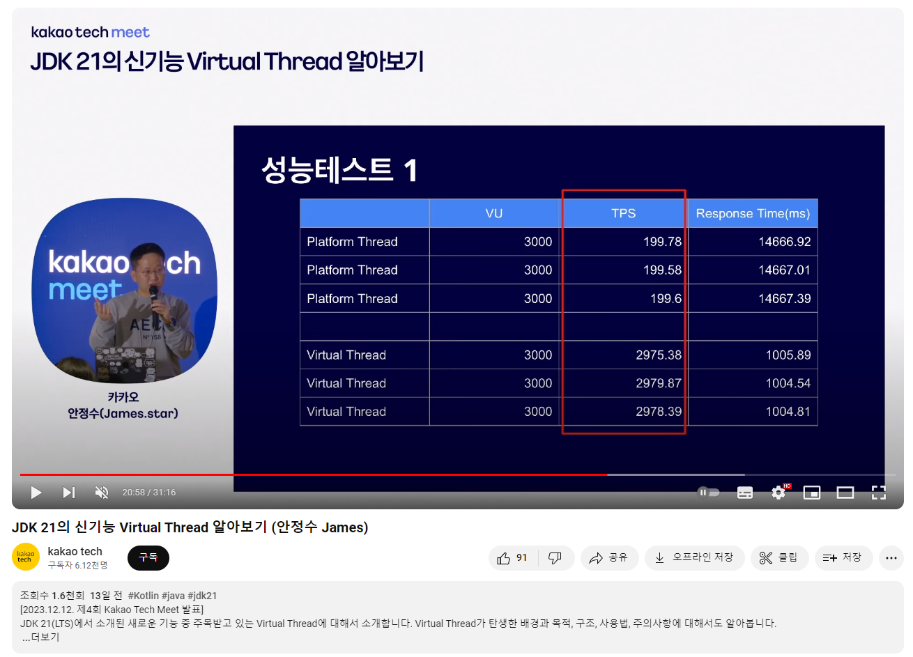 Java 21에 새롭게 추가된 Virtual Thread에 대해 알아본다. 먼저, 가상 스레드를 일목요연하게 정리해 주신 카카오 안정수(James.star)님께 감사드린다. 아래 링크를 통해 영상을 볼 수 있다.