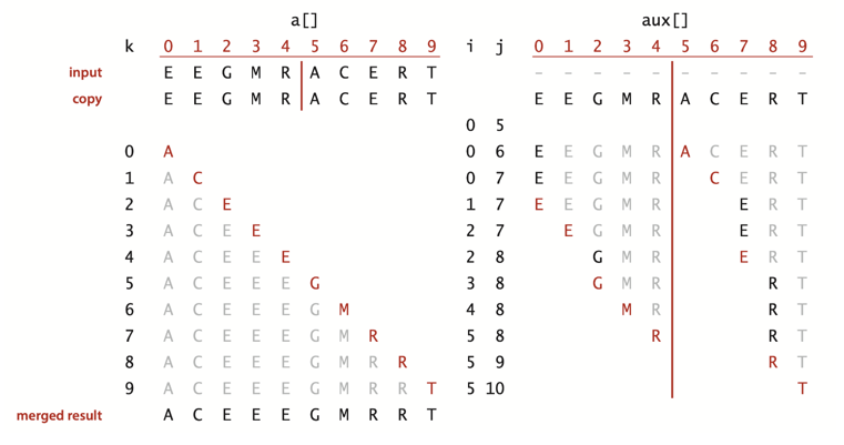 else a[k] = aux[i++]; // 왼쪽이 더 작으면 왼쪽 원소 삽입