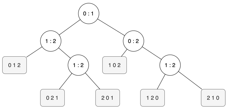 위 트리에서 노드에서 왼쪽으로 가는 경우는 노드의 비교 결과 왼쪽 값이 더 작을 때이다. 예를 들어 루트노드에서 왼쪽으로 갔다는 것은 키 0이 키 1보다 작을 때를 말한다. 위 트리 모델을 토대로 몇 가지를 정리해 볼 수 있는데,