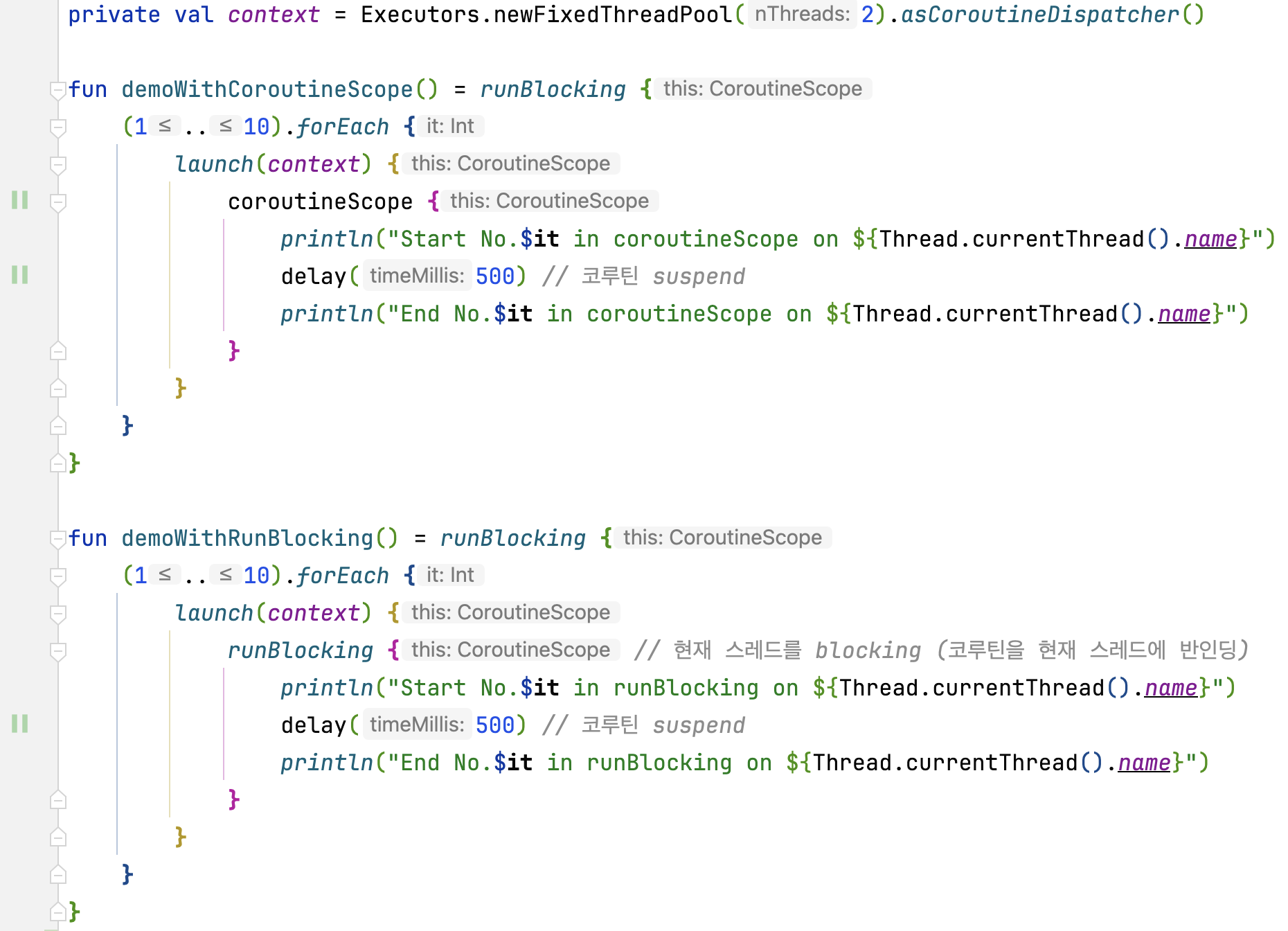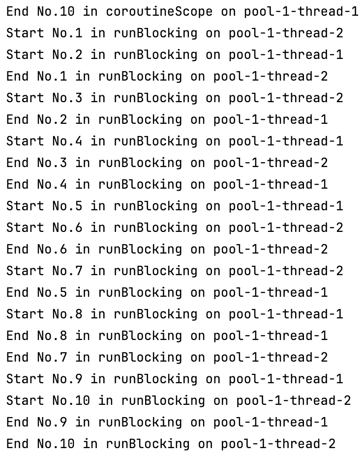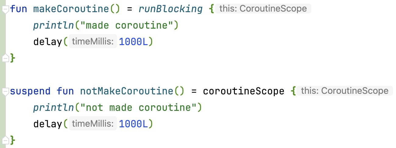 두 빌더는 공통적으로 해당 스코프의 모든 코루틴이 종료될 때까지 최상위 코루틴이 블로킹된다는 점이 있다. 하지만 runBlocking {}은 현재 스레드를 블로킹하지만 coroutineScope {}은 susped funciton으로서 현재 스레드를 릴리즈한다. 아래 두 코드가 어떻게 실행되는지 확인해 보자.