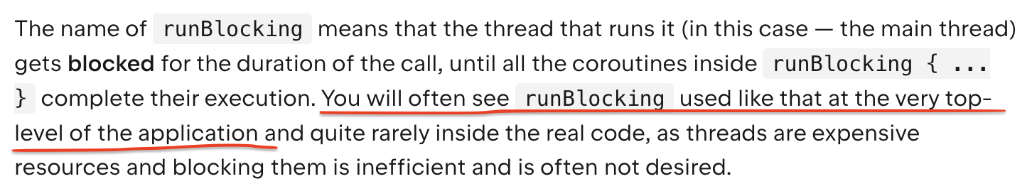 그럼 runBlocking {}은 언제 쓰는가? 공식 문서에도 나와있든 runBlocking {}은 application 내부에서 극히 드물게 쓰이지만, 스레드 세상과 코루틴 세상을 최초 연결할 때는 반드시 필요한 빌더이다. 따라서 application 최초 시작 지점과 같은 곳에서 드물지만 피수적으로 쓰이게 된다.