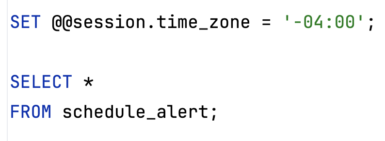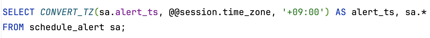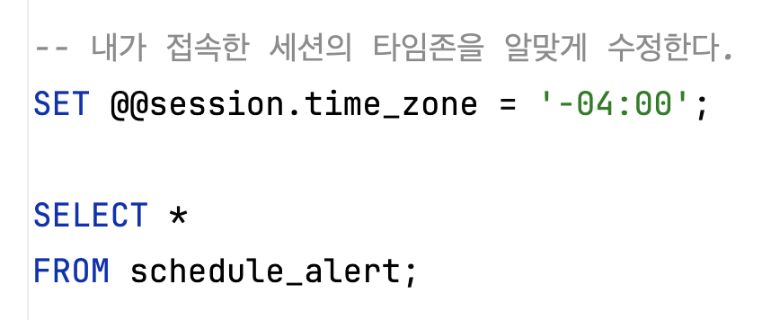 TIMSTAMP는 타임존 정보를 기반으로 UTC 데이터를 변환해서 반환한다. 위처럼 나오는 이유는 뉴욕 타임존 (현재 나의 세션 타임존 정보)에 맞게 변환되어 나오기 때문이다. 따라서 아래처럼 MySQL 함수 CONVERT_TZ()로 현재 session_time_zone에서 변환하려는 타임존으로 보정할 수 있다.