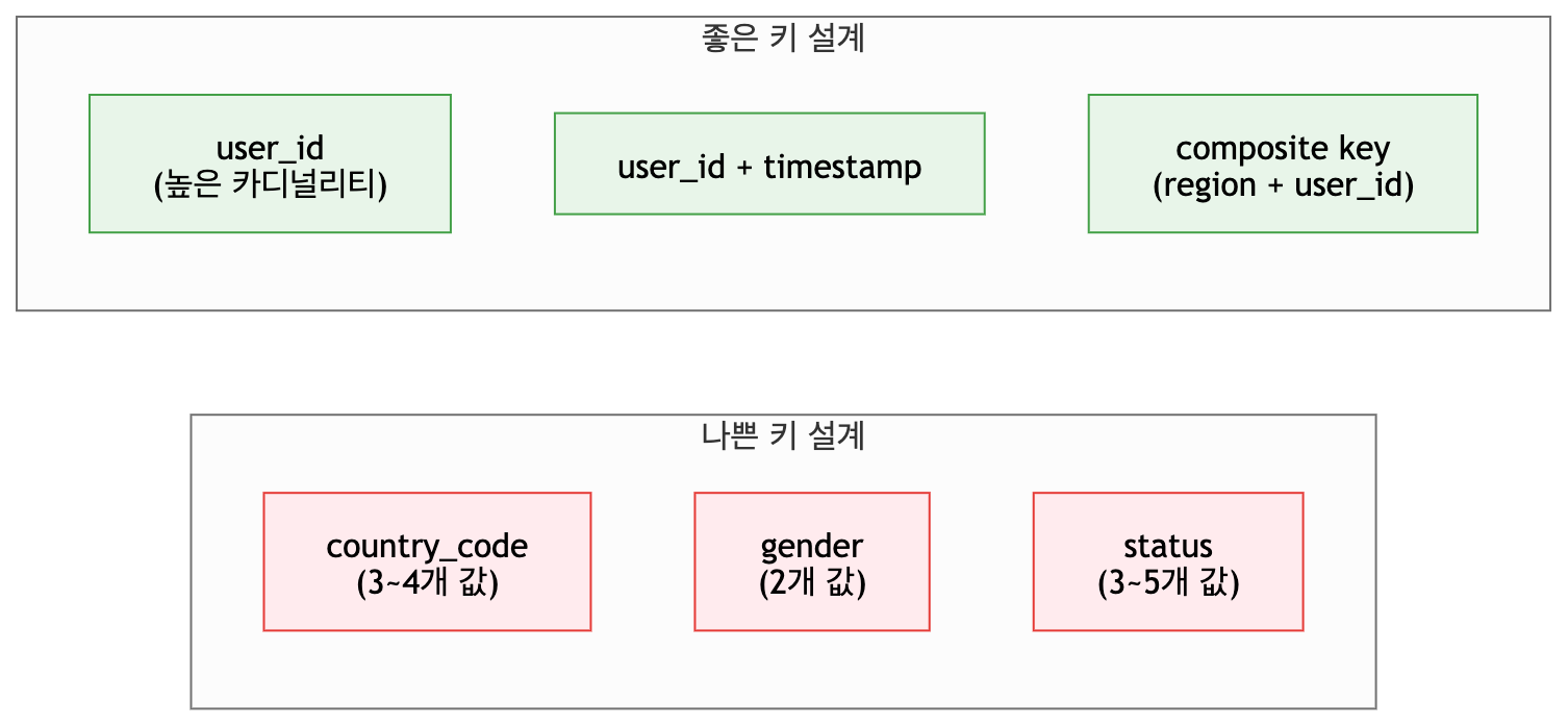 Skew의 근본 원인은 키 설계에 있다. 파티션/샤드 키를 선택할 때 해당 키의 카디널리티와 분포를 반드시 확인해야 한다.