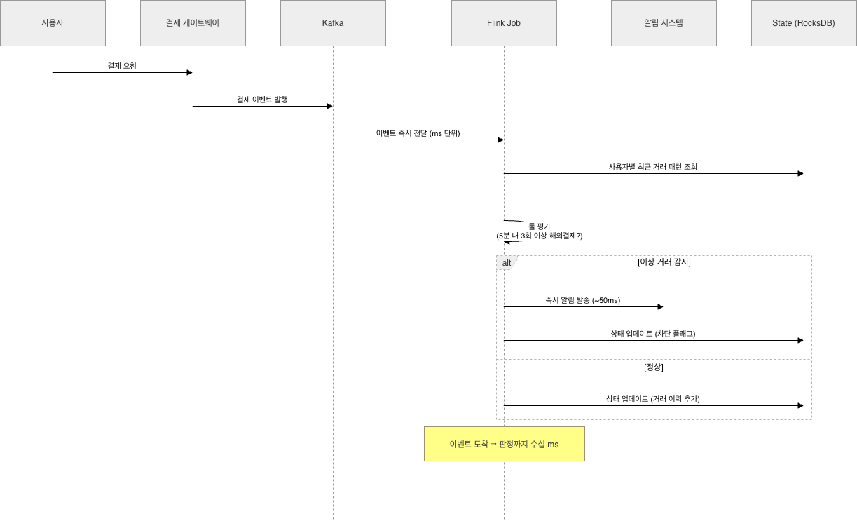- 사용자가 결제 버튼을 누른 바로 그 순간 이상 거래를 탐지한다 → 스트리밍