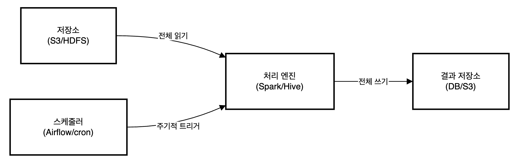 적합한 유스케이스: 일별/주별 리포트, 대규모 집계(매출 정산), ML 모델 학습, 데이터 웨어하우스 적재