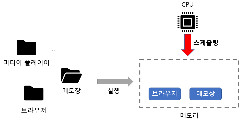 프로세스의 생성, CPU 할당, 삭제를 위한 스케쥴을 결정합니다. 프로세스의 개념에 대해서는 바로 다음 포스팅에서 상세히 기술하겠습니다.