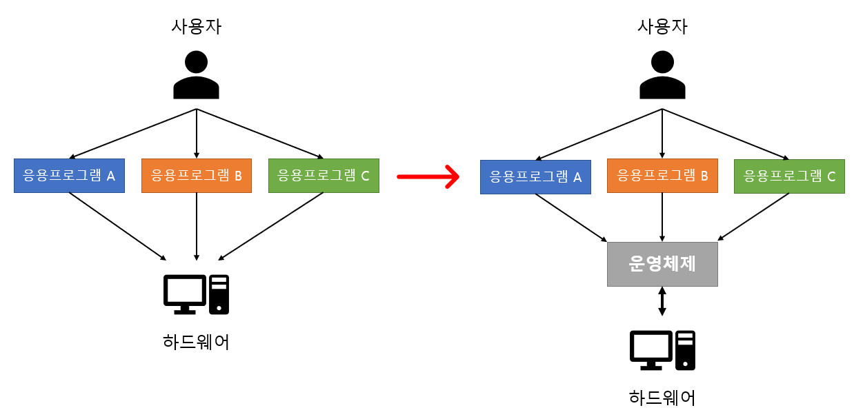 운영체제가 없던 시절에는 응용프로그램을 개발하는 개발자들이 하드웨어의 제어방법을 알고 프로그램을 개발해야했습니다. 그리고 1개 이상의 응용프로그램들이 하나의 하드웨어를 직접 접근하기에 하드웨어의 자원분할에도 어려움이 있었습니다.