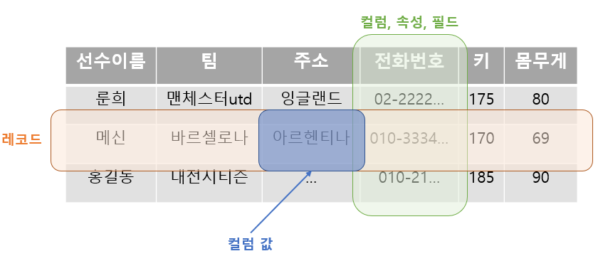 위 표 자체가 하나의 인스턴스입니다. 컬럼 값 (데이터)는 2개 이상의 메타데이터로 이루어집니다. (예 : '아르헨티나' 값은 '메신', '바르셀로나'라는 메타데이터로 이루어진 주소 데이터)