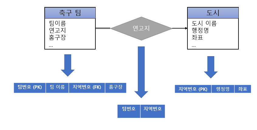 연고지라는 관계 집합 자체도 하나의 릴레이션으로 변환할 수 있습니다.