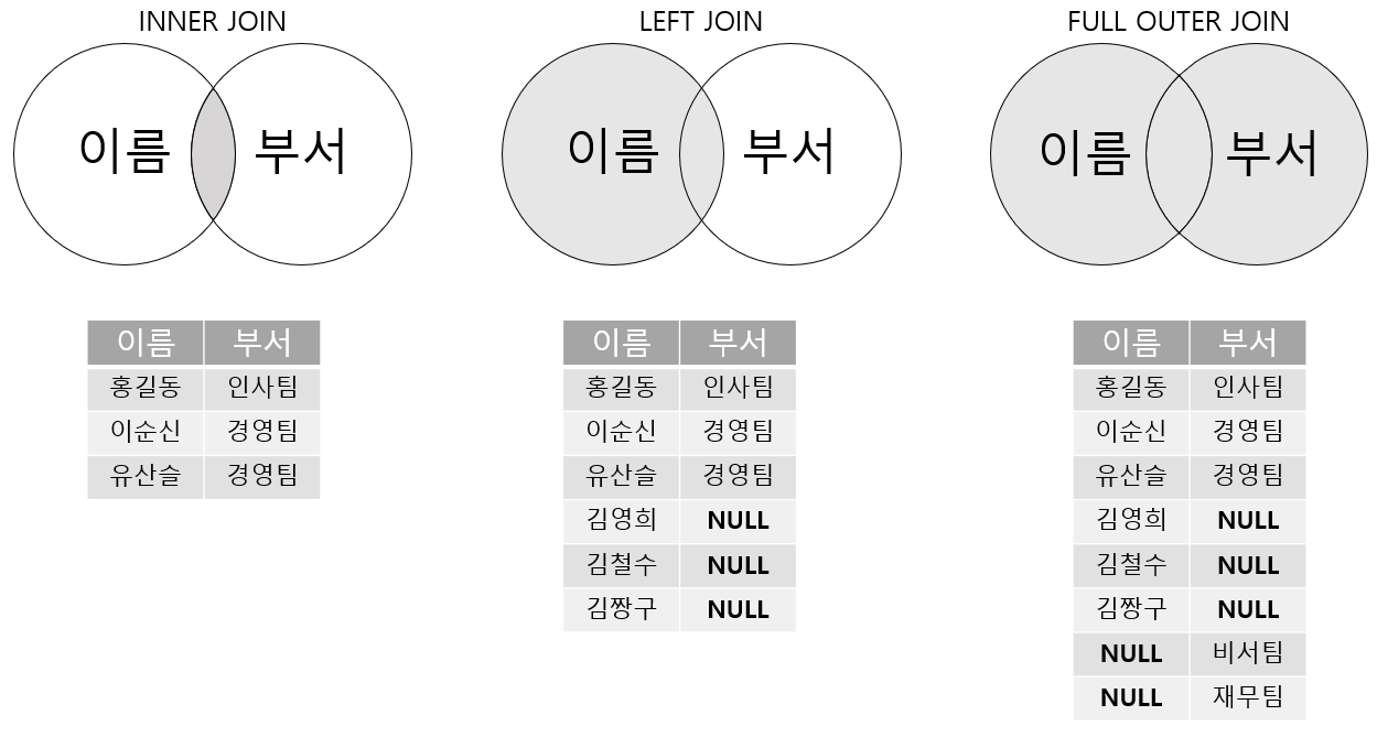 - FULL OUTER JOIN : 양쪽 테이블의 데이터 전부 출력