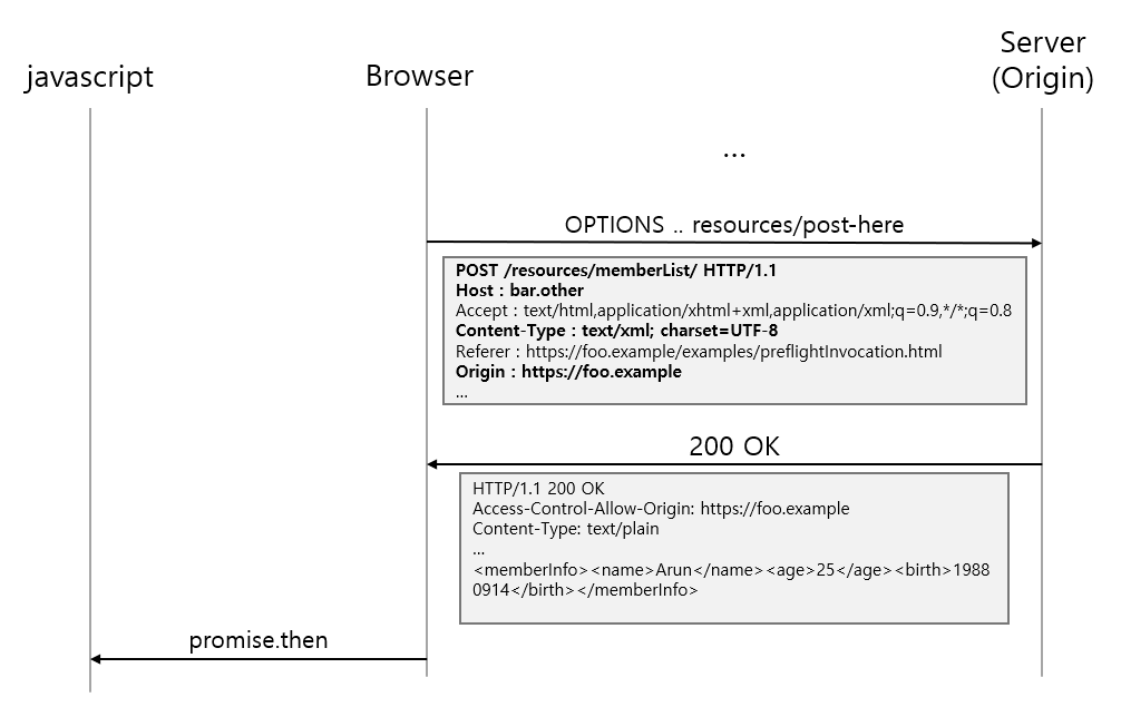 비표준 http header가 들어가 있고, content-type이 application/xml이므로 simple request 할 수 없습니다. 먼저 preflight request / response가 아래와 같이 작동합니다.